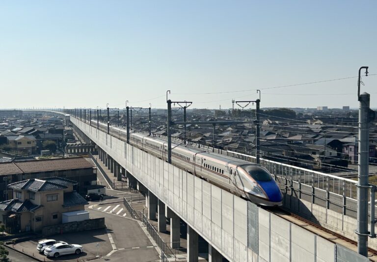 そして屋上展望室エリアへ!ここでは、走行する北陸新幹線が間近で見る事ができます。トレインパーク白山の横を通過する際は200㎞/hを超えるスピードで駆け抜けていき、迫力満点です!通過時間は短いのでシャッターチャンスを逃さないように!