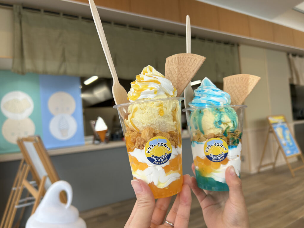 デザートでの注目はパフェにもドクターイエローが登場したこと!ぷちぷちマンゴージュースとバニラアイスの上からマンゴーソースをかけたドクターイエローカラーの映えスイーツ。食べればきっと幸せになること間違いなしです!