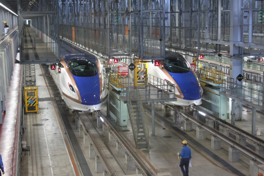 5階を思う存分楽しんだら階段を降りて4階に。通常稼働の車両基地を、自分のタイミングでいつでも見学できるのは日本でここだけ。実際に整備点検している様子を見ることができ、1階の展示エリアにこの施設のMapがあるので答え合わせするのも楽しそう!豆知識として、名称に”総合”とある車両所では全ての整備点検ができるそう。W7系(West)の新幹線は全てここに帰ってきます。新幹線の数は時間帯によって違い、新幹線が入ってきたら警笛が鳴るようです。