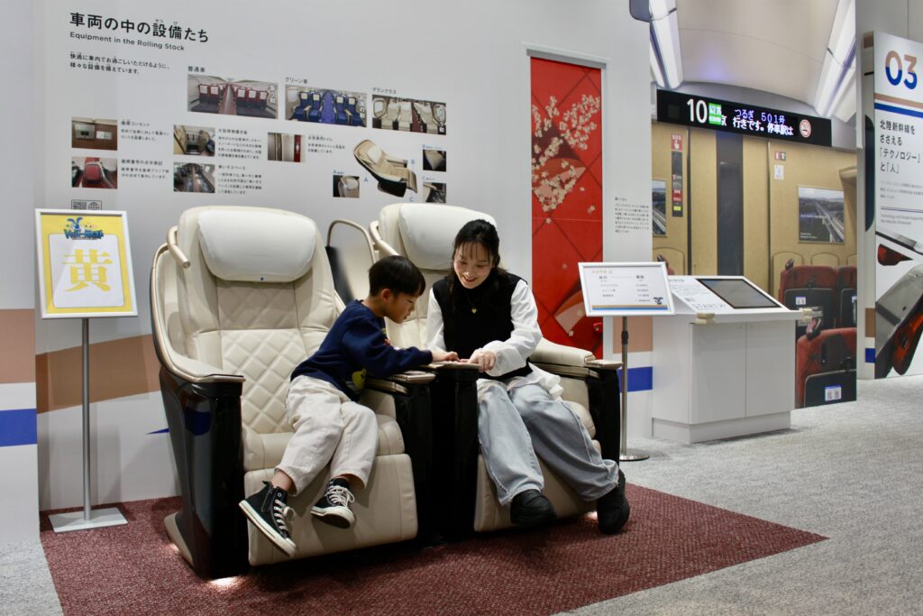 白いスペースでは北陸新幹線のグランクラスのシートを体感できます。座り心地が良くて離れたくなーい!でも順番待ちがある場合はスムーズに次の人に譲りましょう。隣では自分好みの車内テロップを作成できるので鉄道ファンにもたまらない演出です。