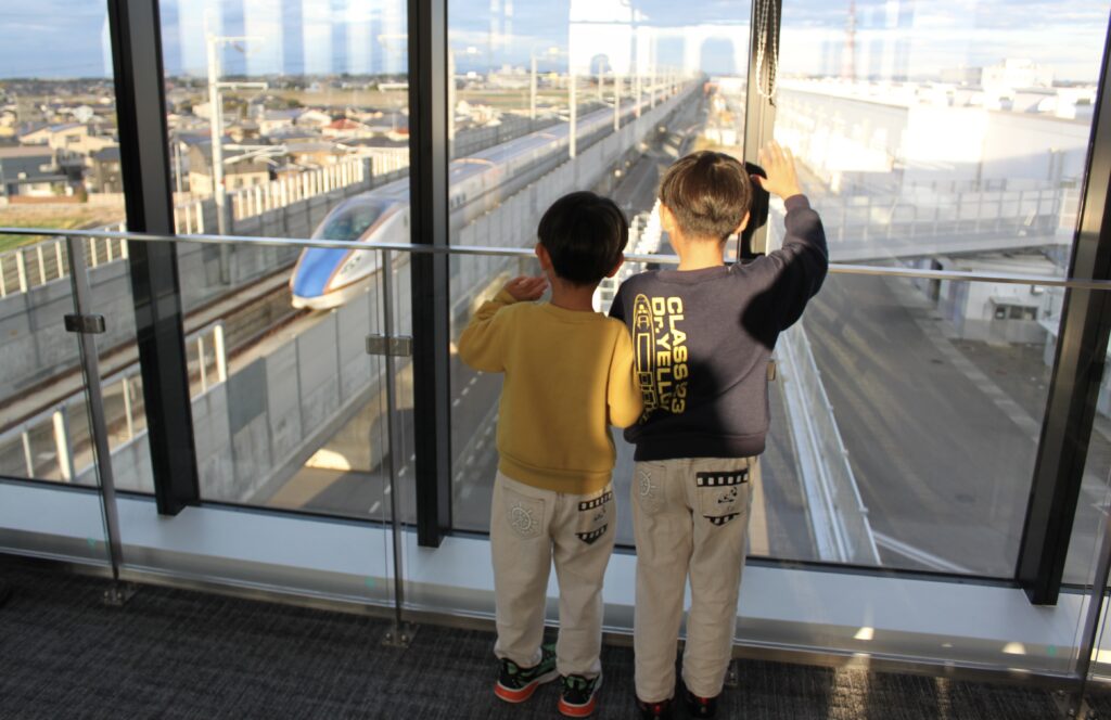 5階の屋上展望室エリアでも新幹線は見えますが、4階は穴場!壁があるので見られるスペースは少ないですが、線路と同じ目線で見る事ができるのでよりスピードを感じやすいです。