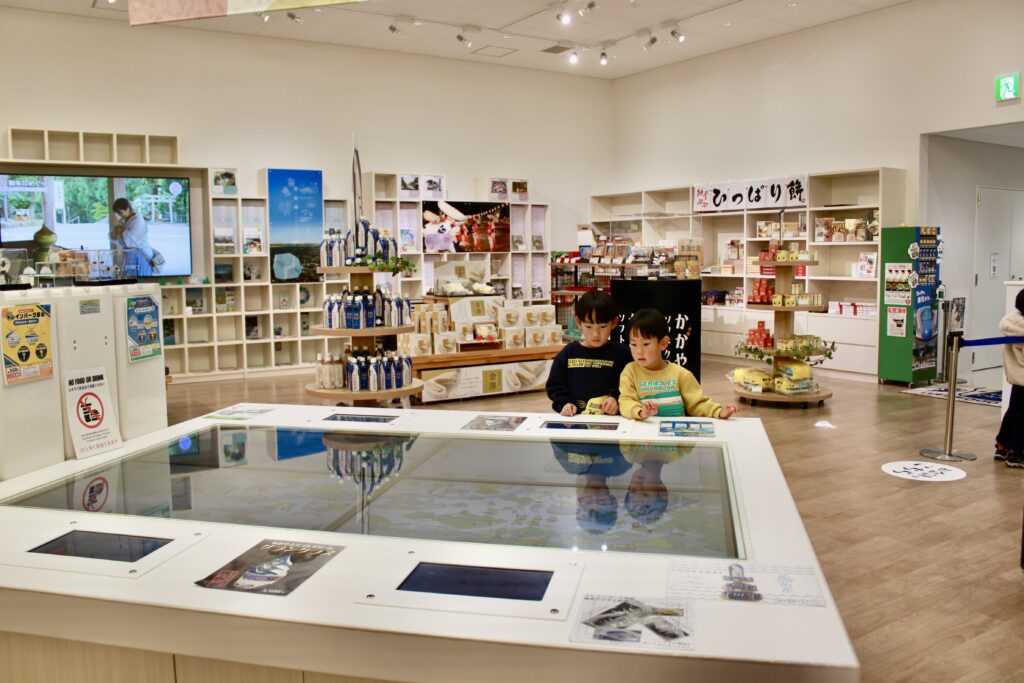 最後に大人からこどもまで喜びそうな物がたくさん販売されてるおみやげエリア。白山市のお土産も販売されており、白山市周辺の能美市・川北町・野々市市の観光情報もあるので観光場所に困らなさそう。この中央にあるテーブルでもおすすめの観光情報を教えてくれます。コンシェルジュもいましたよ!