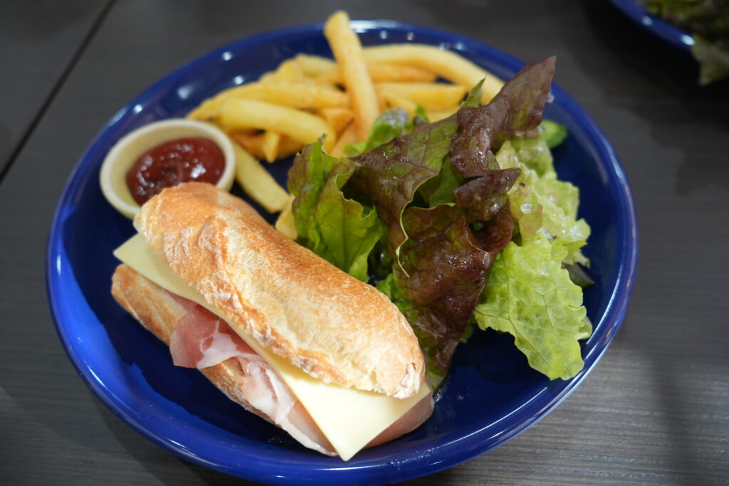 夫は、サンドイッチプレートを注文していました。パンは、クロワッサン・バゲットから、中身は、生ハム&チーズ・チキン&サラダ・ハムサラダ・ハムエッグから選べます。ホクホク美味しいフリッツと新鮮野菜も付いており、栄養バランス満点なランチプレートに夫も満足げでした。