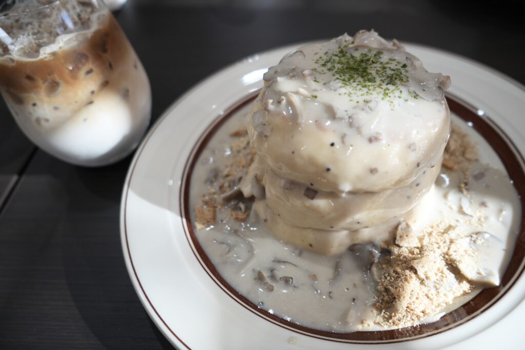 お腹も空いたので、2025年11月7日に新たにオープンしたCAFE MOOIさんで九頭龍まいたけホワイトグレイビーソースのパンケーキをいただきました♪ふわふわ・しゅわしゅわとろける食感で、豪華な見た目ですがペロリと食べられました!優しい甘さのパンケーキと、大人な味わいの九頭龍まいたけホワイトグレイビーソースが組み合わさり至福の味わいでした。