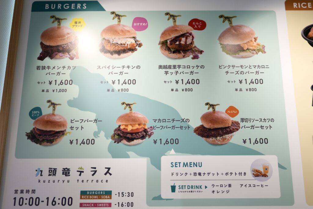 「九頭竜テラス」さんでは、多様なハンバーガーと、恐竜の形をしたチキンナゲット、ポテト、ドリンクがセットで注文できます。