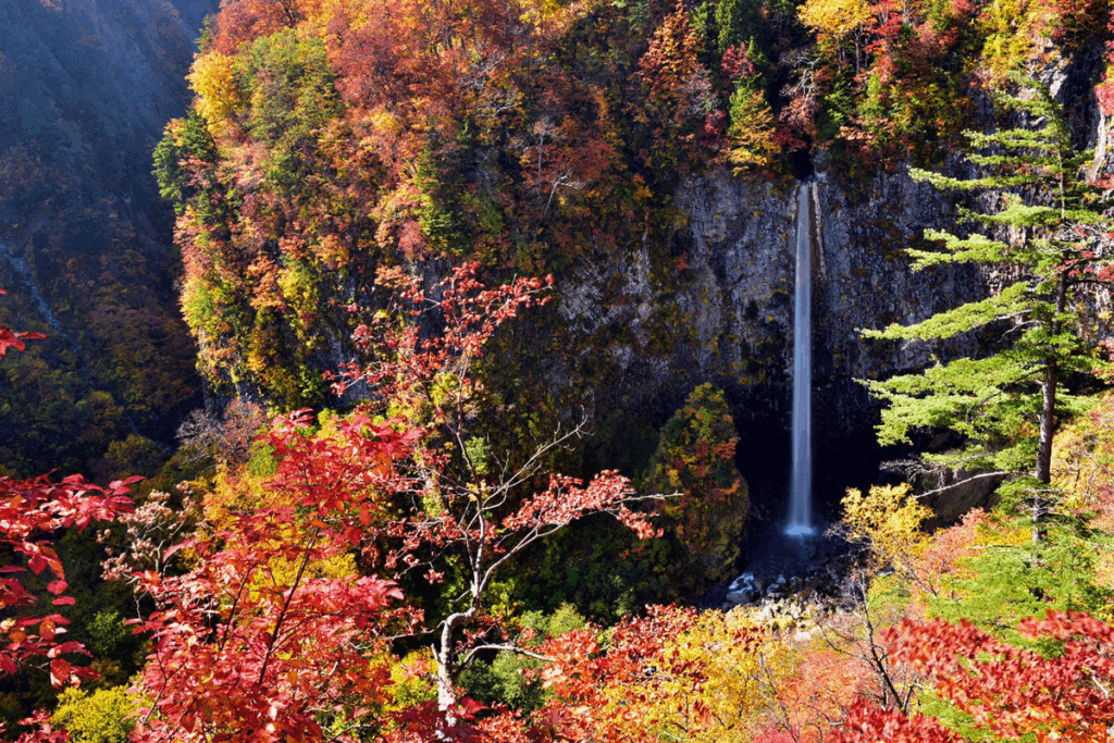 展望台からは、白水滝と生い茂るブナ林が織りなす絶景を望むことができ、特に紅葉の時期はため息が出るほどの美しさです。