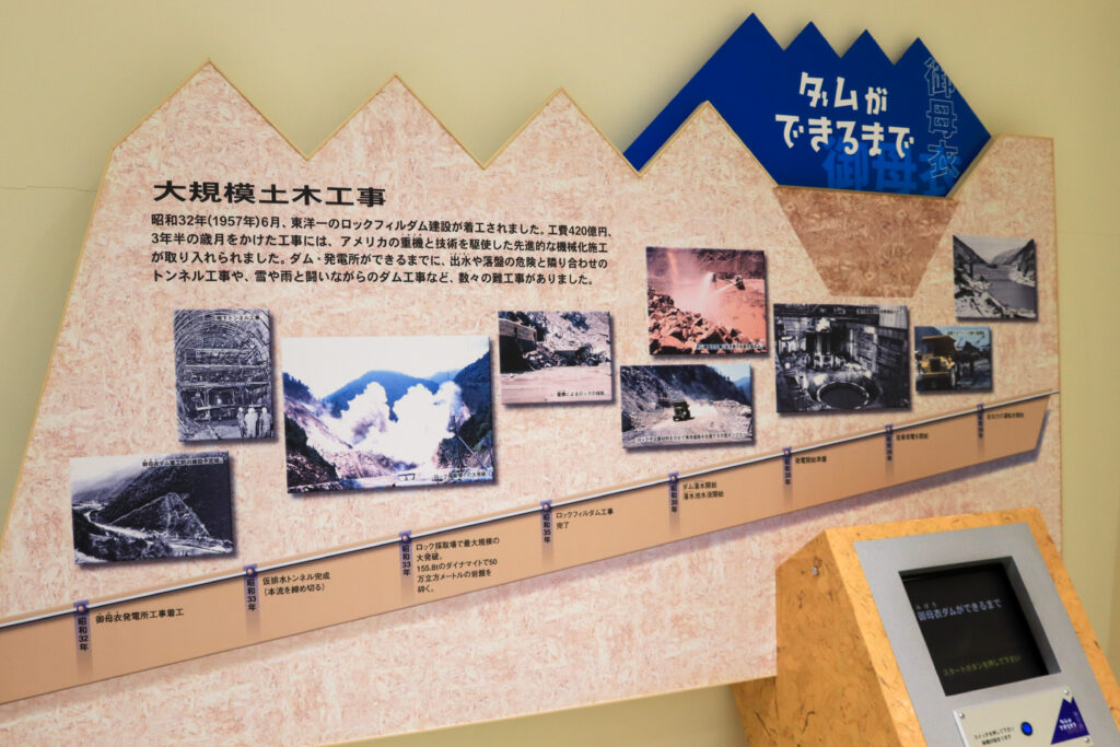 ダム湖の中を潜水艦に乗って冒険する映像アトラクション「サブマリンフィッシュ」や、発電専用ダムである御母衣ダムがどういう経緯で造られたか、記録動画や展示パネルなどで知ることがきます。