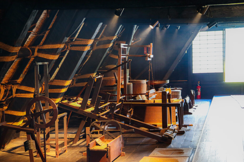 急な階段を上り2階に行くと合掌造りの構造を間近で見ることができ、当時の生活には欠かせなかった道具類の展示もされており思わず見入っちゃいますよ。