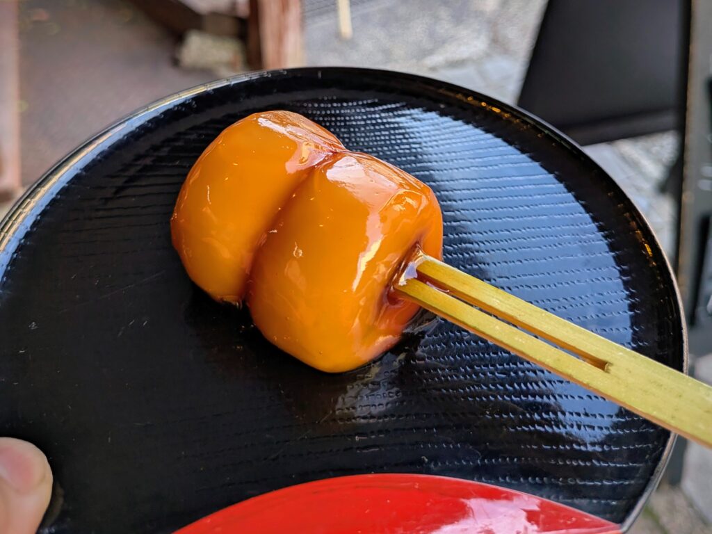中にはこしあんが入っていて、冷たくて柔らかく、もちもち食感の甘じょっぱいお団子です。郡上八幡の人気店、「ひがしのくま家 おかずや五代目」でいただけます。