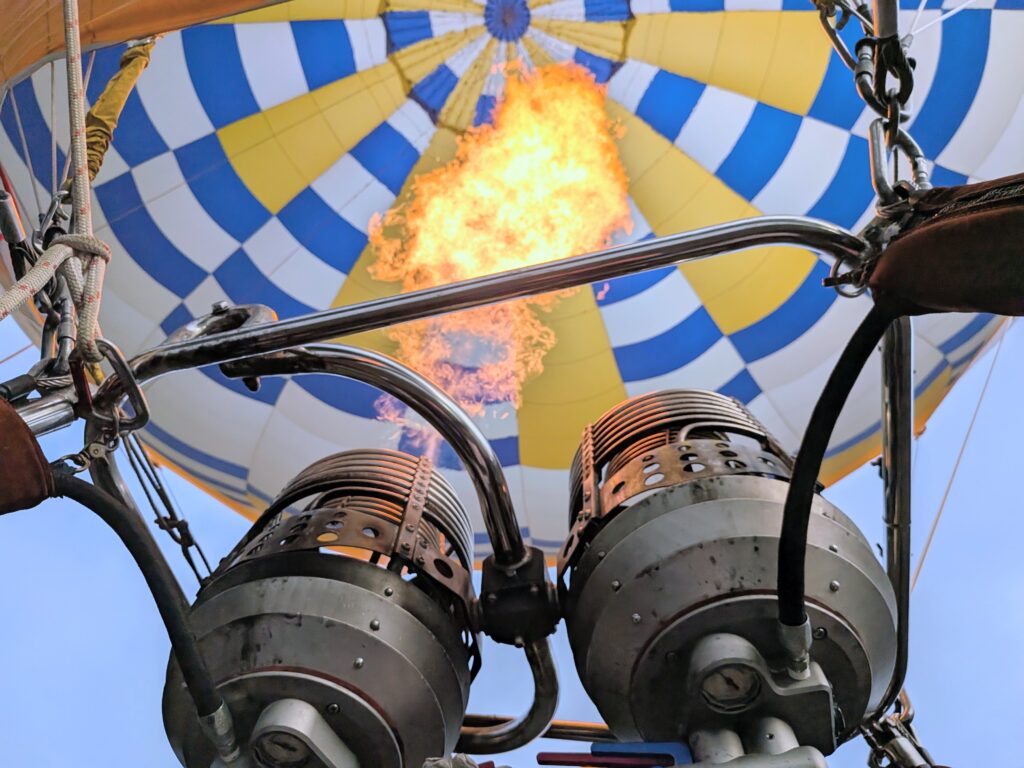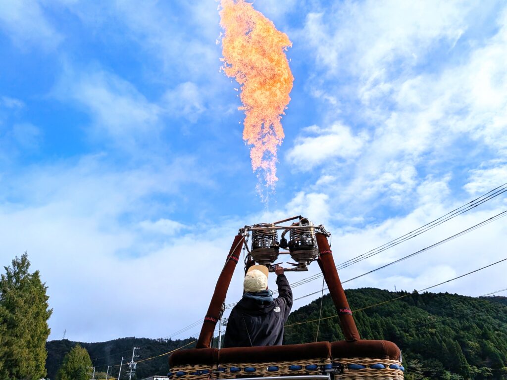 バーナーで気球内の空気を温めて浮かぶのが、熱気球の仕組みです。とてもシンプルですが、バーナーから勢いよく炎が噴き出す様子は迫力満点。そして、それとは対照的に、気球自体は音もなく静かに上昇していきます。