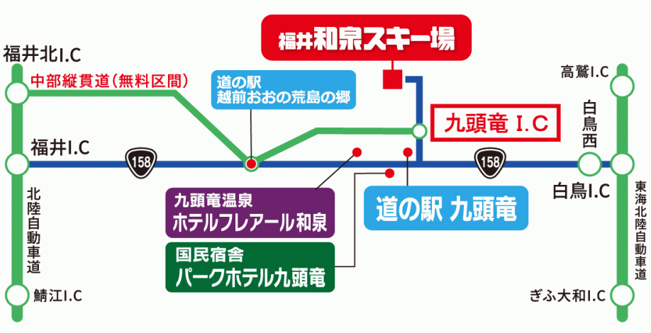 中部縦貫自動車道・九頭竜ICからわずか2.5km。大野市内からも車で約25分とアクセスしやすい立地にあります。スキー場には、約700台を収容できる無料駐車場を完備。ゆったりとしたスペースで、ファミリーやグループでも安心して利用できます。