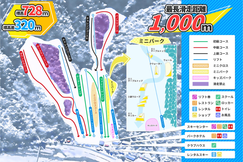 ゲレンデは最長1,000mの滑走距離、標高差320mを誇り、その約9割を見渡せる開放的なつくりが魅力です。視界が広く、死角が少ないため、初心者でも安心して滑走を楽しめます。晴れた日には白銀の山々が一望でき、自然の中をすべる爽快感は格別。のびのびと滑れる環境が整っています。