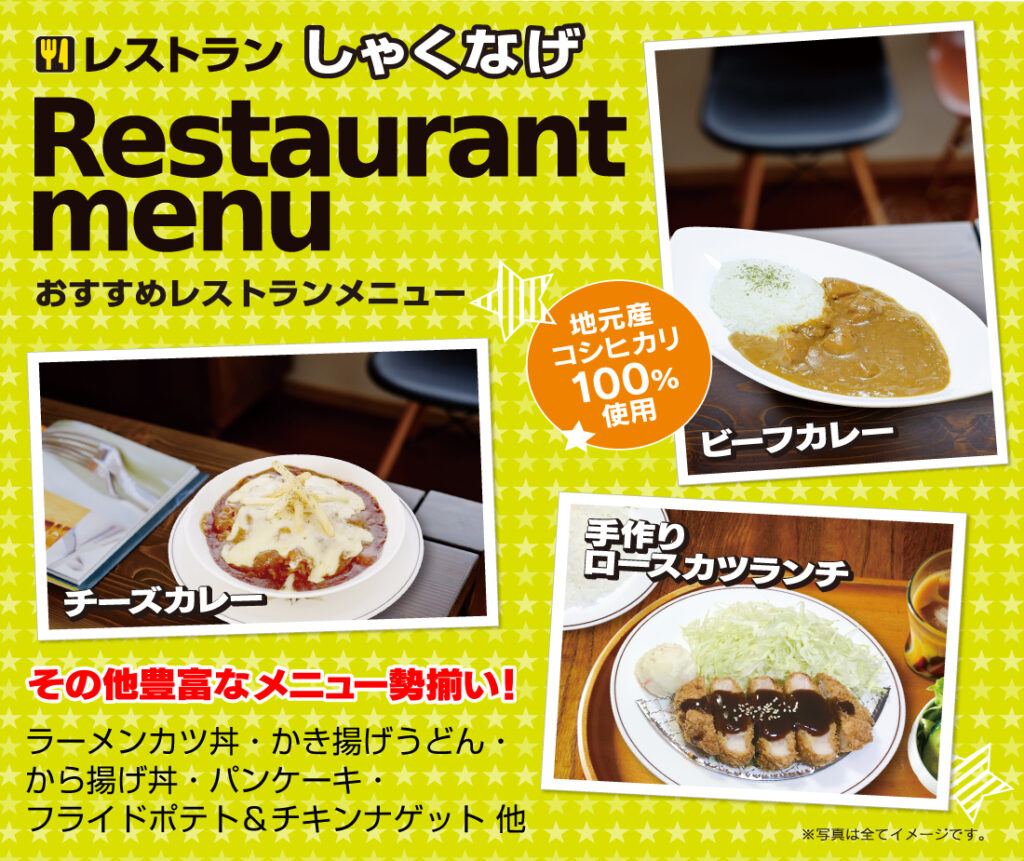 ゲレンデ内の人気レストラン「しゃくなげ」では、地元産コシヒカリ100%を使用したごはんや、手づくりのロースカツランチなど、こだわりのメニューが勢ぞろい。雪景色を眺めながら味わうランチは、冷えた体にうれしいごほうびです。また、24時間利用できる更衣室や休憩室も完備しているので、早朝に到着しても安心。思い思いの時間を過ごせます。