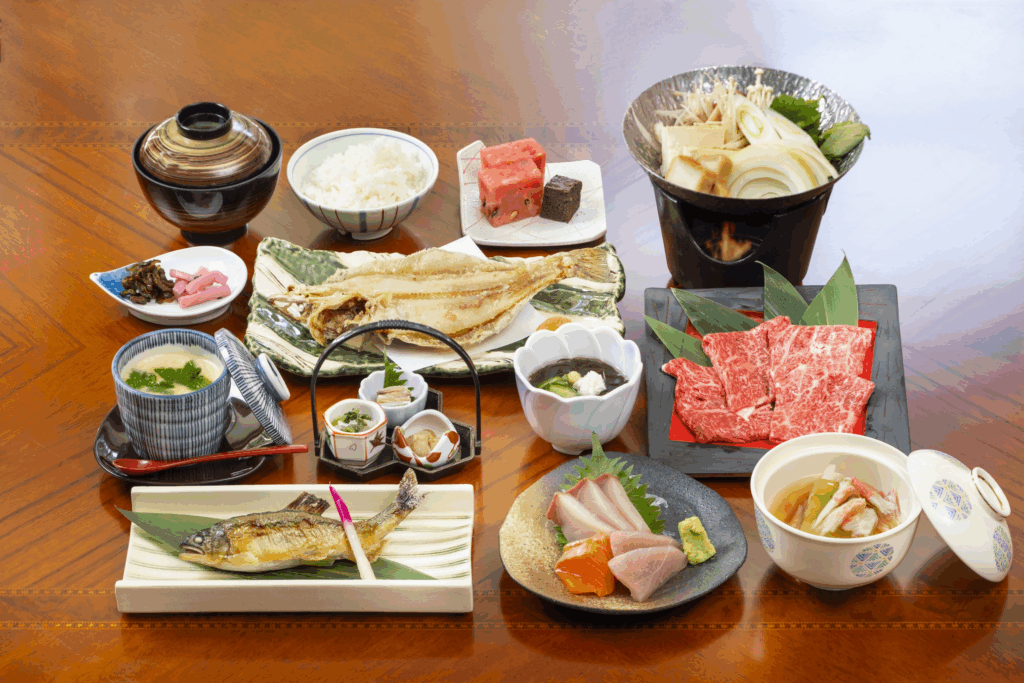 夕食には、四季折々の食材をふんだんに使った会席料理を堪能できます。地元で採れた山菜や川魚、旬の野菜を丁寧に仕上げた一品一品は、見た目にも華やか。冬の寒さの中で味わうあたたかな料理は、まさに旅のごちそうです。旬の味わいと心づくしのおもてなしに包まれながら、心も体も満たされる至福のひとときを過ごせます。