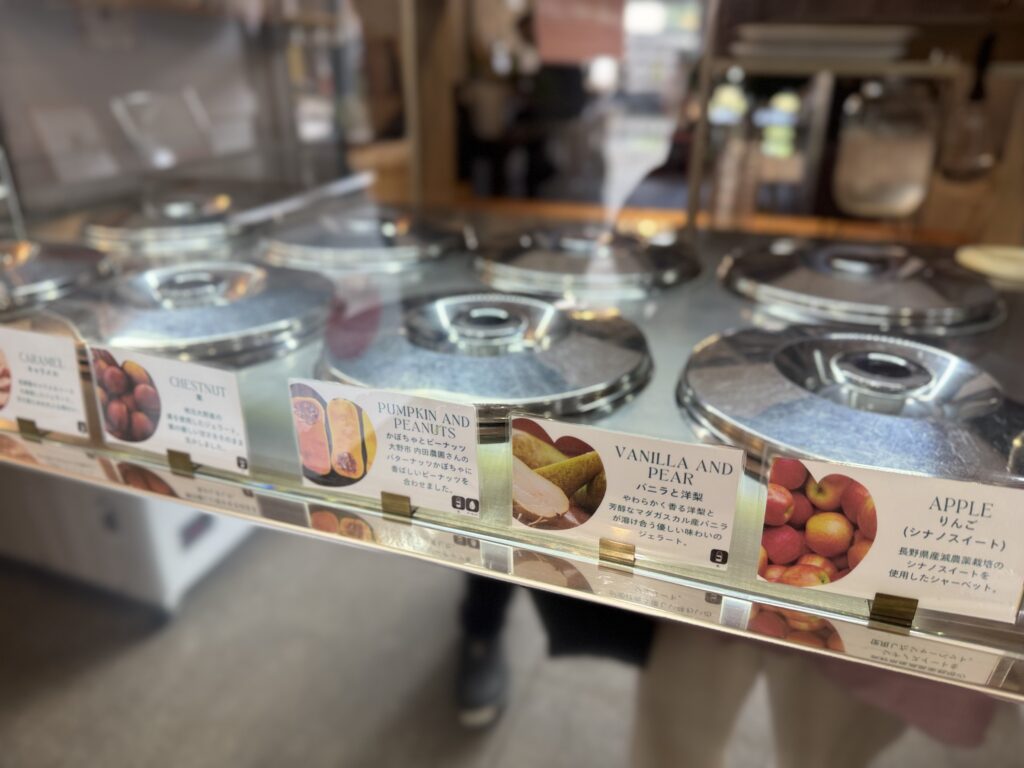 季節ごとに登場する限定フレーバーも多く、訪れるたびに「今日はどんな味があるかな?」とワクワクします^^しかも毎日作りたて!!この日も悩みに悩んで(笑)、秋限定の「バニラと洋梨」と「栗」をダブルでチョイス!このピンクのカップも可愛いんですよね~。