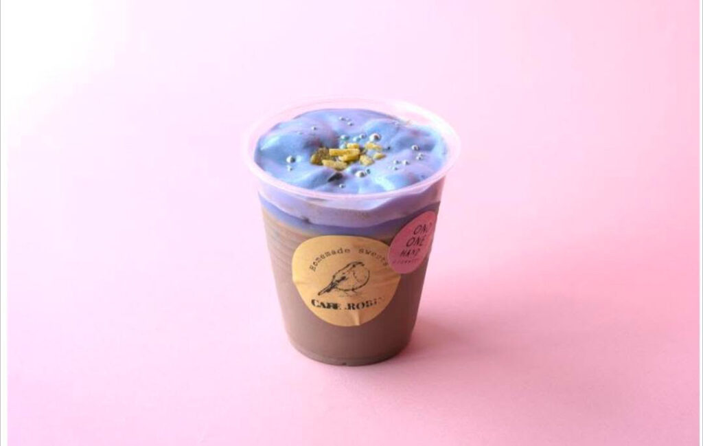 アイスだと透明な容器で、とっても可愛い見た目が分かりやすいと思います^^何と大野産の里芋を、豆乳ココアと合わせてブレンドしたドリンク!バタフライピーパウダーで色付けした青い豆乳ホイップと、星のように散らした大野の名菓「けんけら」がアクセントになっています。