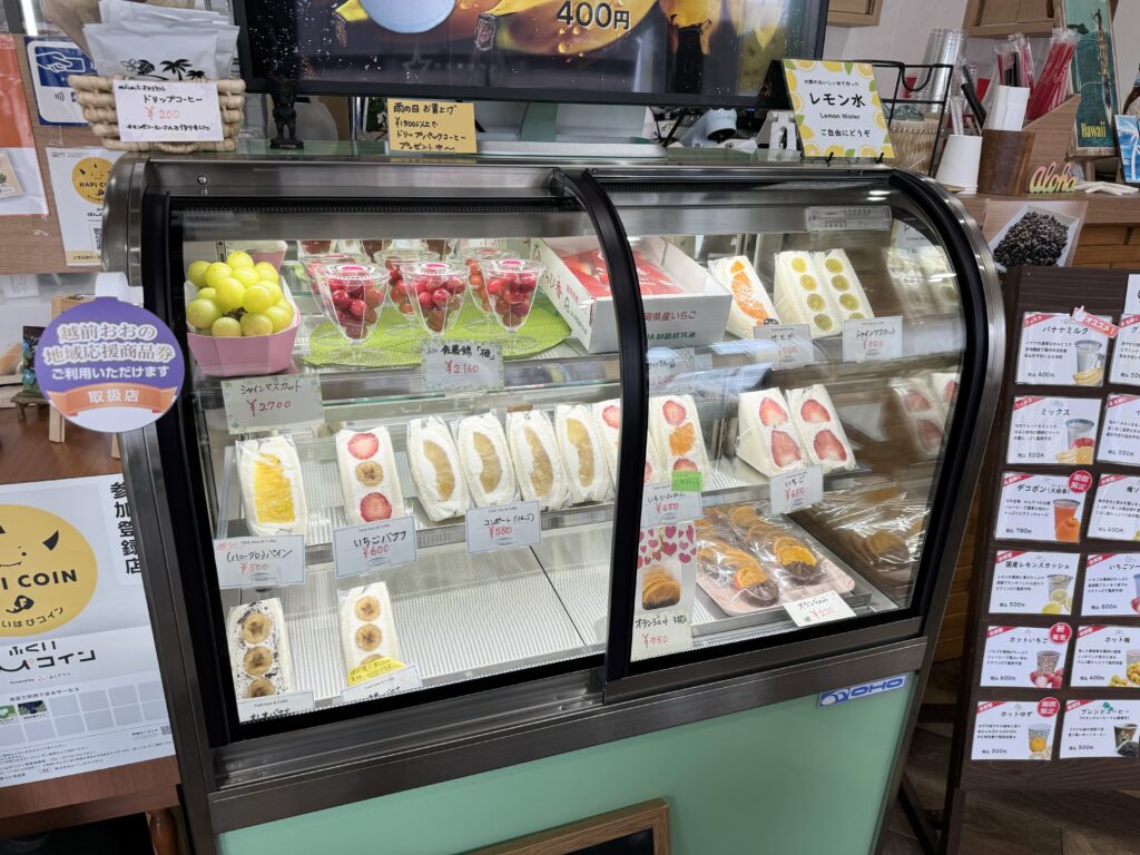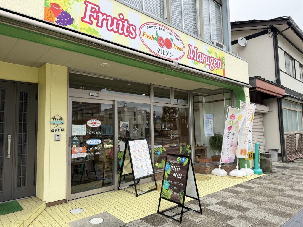 六間通りにある果物店「フルーツのマルゲン」では、旬の果物をふんだんに使ったフルーツサンドや、フレッシュジュースが楽しめます。