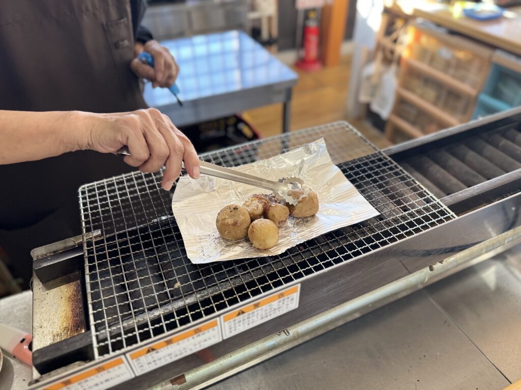 注文したのは「里芋でんでん」。大野といえば里芋!という方も多いと思いますが、里芋でんでんは、大野在来種の里芋の煮っころがしを、手作りの味噌と地元産のねぎをまぶして香ばしく焼き上げた一品。注文すると、網で焼きたてを提供してくれます。これがとってもいい香りなんですよね~♪