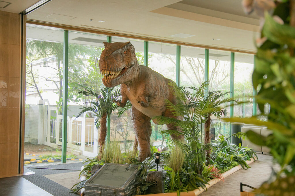 玄関では大きな恐竜がお出迎えしてくれます。このホテルは朝食ビュッフェも人気。