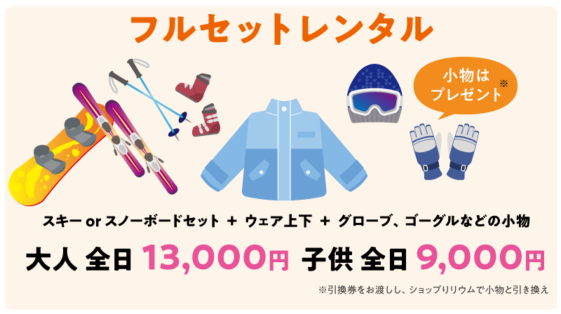 | フルセットレンタル (スキーセット・ウエア上下・小物セット) ※小物(グローブ、ニット帽、ゴーグル)はプレゼント (引換券をお渡しし、ショップリリウムで小物と引き換え) | 大人¥13,000 |
