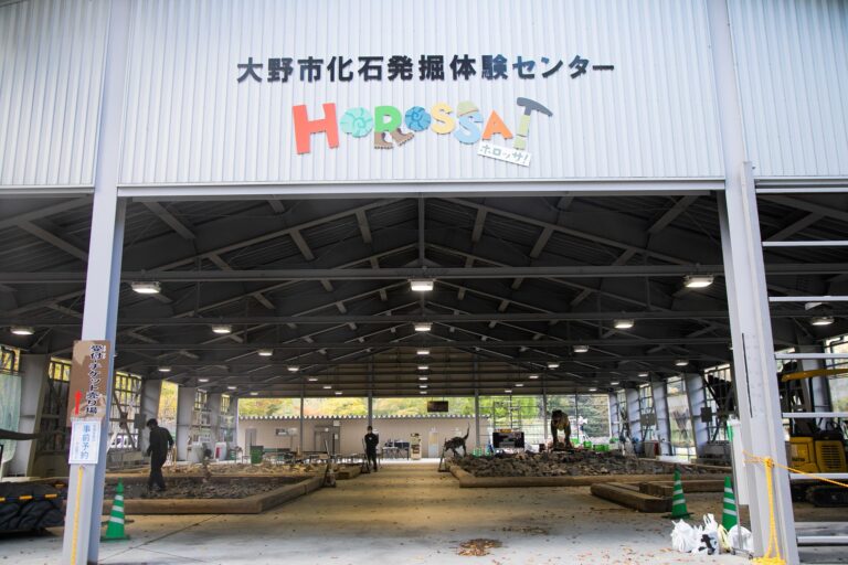 大野市にある「化石発掘体験センター HOROSSA!」は、広々とした施設の下にたくさんの石が敷き詰められており、白亜紀・ジュラ紀・デボン紀の3つのエリアに分かれています。