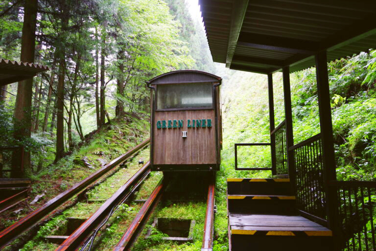 常時運行の木製ケーブルカーに乗って、入口へGO!途中の「大滝カーテン」では、鍾乳石に触ることもできます!