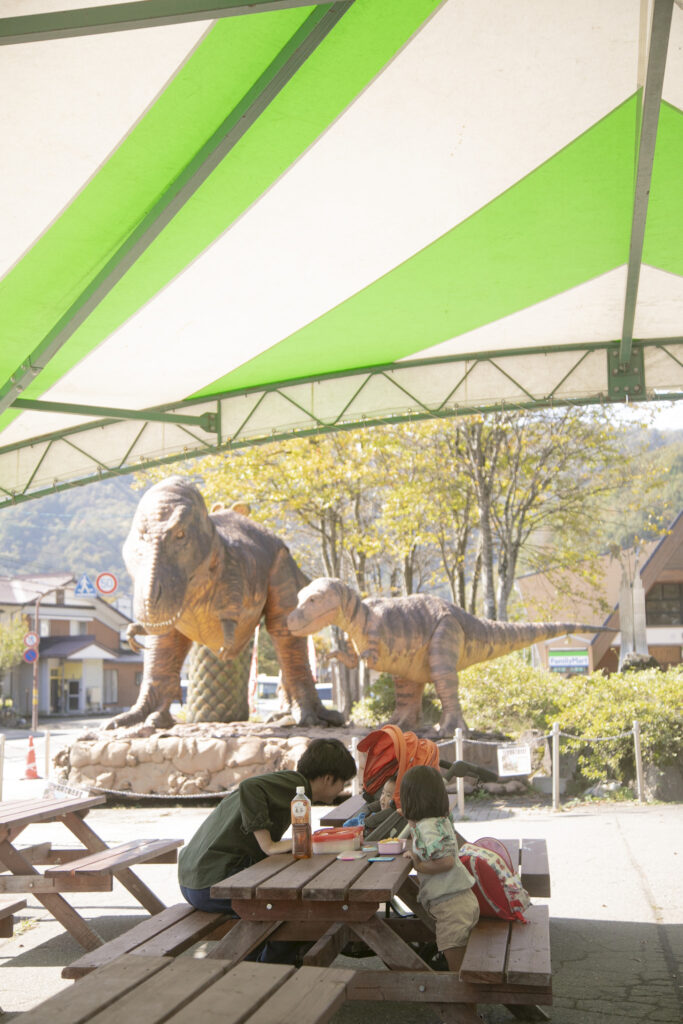 箱ヶ瀬橋から車で約18分ほど走ったところにあるのが「道の駅 九頭竜」。JR九頭竜湖駅や生産物直売所、お食事施設などがひとつにまとまった場所です。ここでは、迫力満点の動くティラノサウルス親子がお出迎えしてくれます!