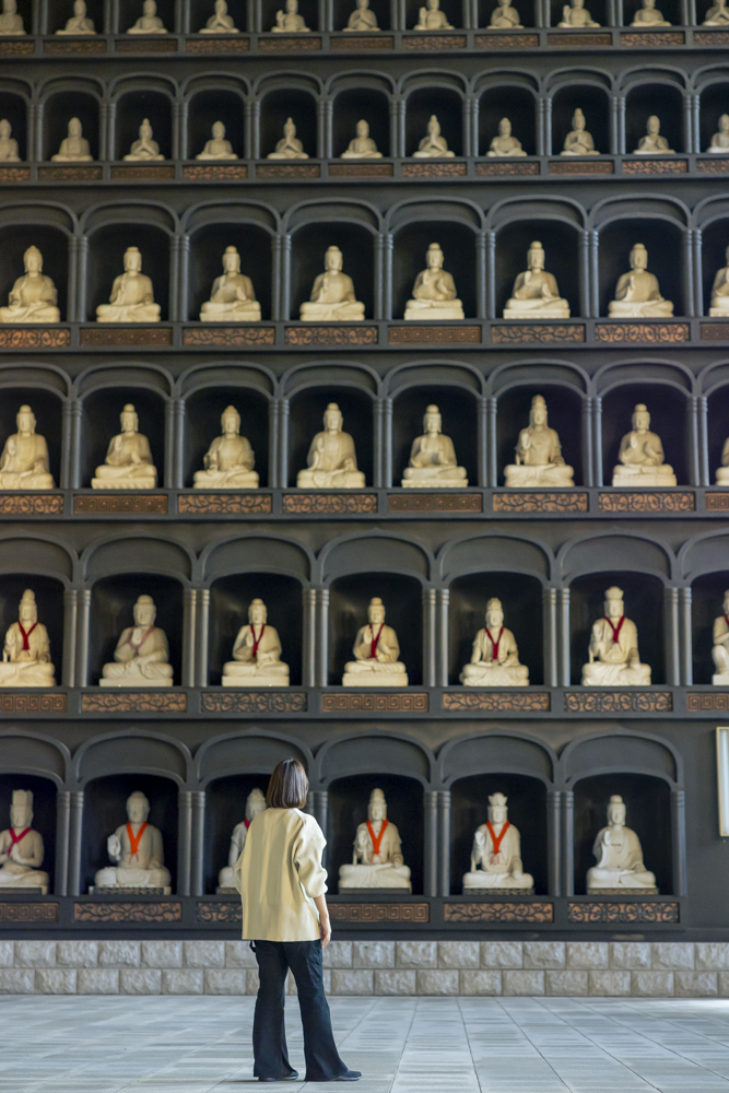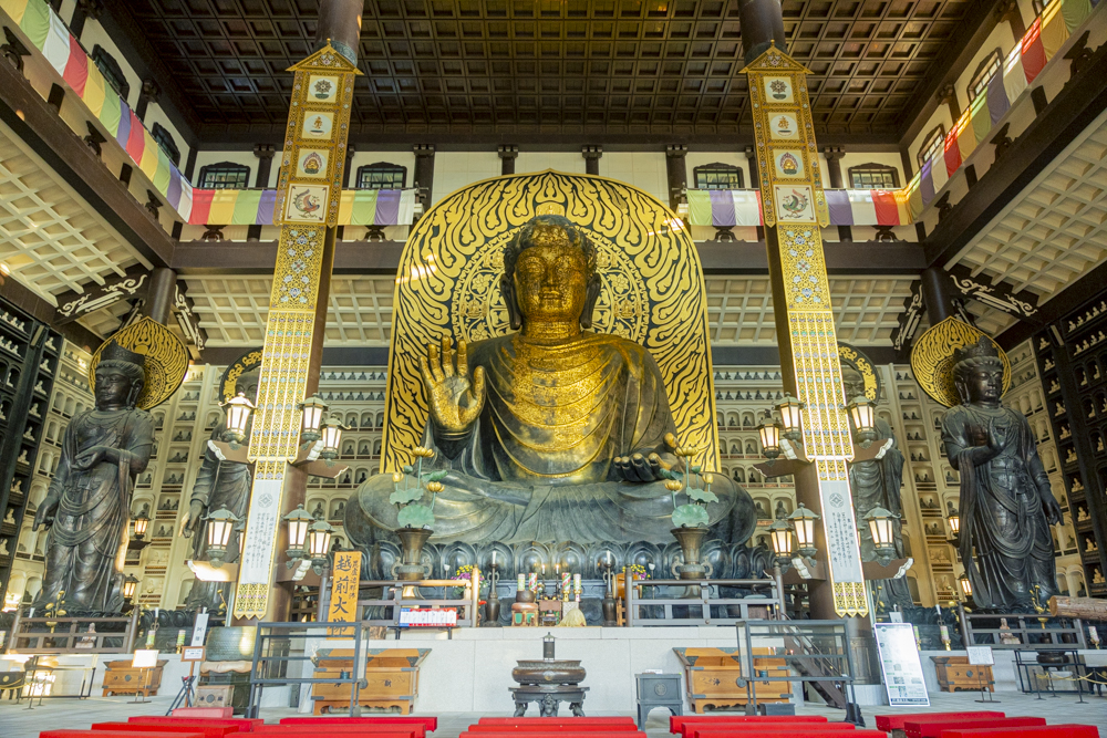 高さ17メートルの越前大仏の両脇には、羅漢像(10.3m)と菩薩像(11.2m)が二体ずつ並び、圧巻の存在感。大仏殿には複数の窓から自然光が差し込み、黄金に輝く越前大仏がゆっくり浮かび上がるように見えます。その荘厳で神秘的な雰囲気は、写真では伝えきれないほど美しい光景です。