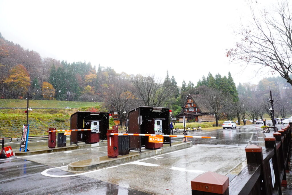 白川郷の駐車場入口にはゲートがあり、まずはこちらで案内を受けます。今回は「村営せせらぎ公園駐車場」を利用しましたが、混雑時には別の駐車場へ誘導されることもあるそう。スムーズに回れるよう、早めの到着がおすすめです。