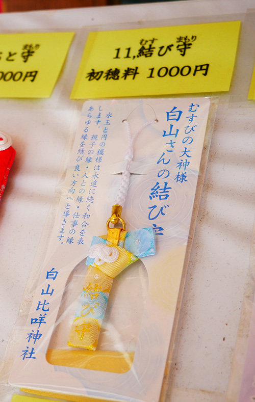 白山比咩神社には、良縁を願う参拝者が多いことから、お守りの種類もとても豊富。なかでも人気なのが『結び守』です。縁を結ぶ神様を祀るこの神社ならではのお守りで、リボンのような可愛い形も魅力。手にした瞬間、気分がふっと明るくなるお守りです。