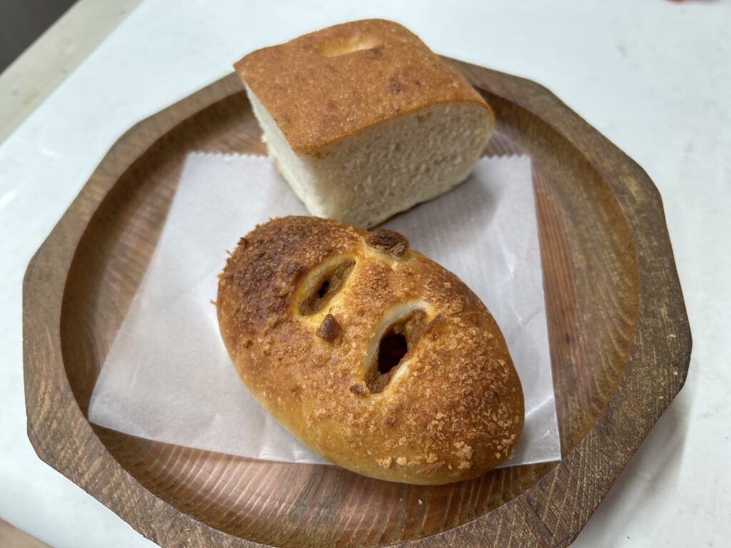 ファンが多い「米粉フォカッチャ」と「焼きカレーパン」。「車多酒造」の酒米の米粉を利用したフォカッチャは、ほんのり甘口で、しっとり、とサクッ、が一度に味わえる両得なパンです。キーマカレーのカレーパンには石川県産の大豆を使用。揚げずに焼いてあるので、ヘルシー感覚で食べられますよ。