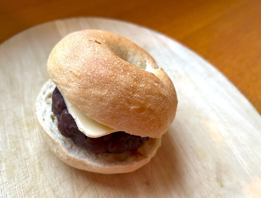 こちらも背徳系の「あんバターべーグル」。サックリとしたベーグルに自家製あんことバターの塩味がベストマッチ。ちなみに、前のカスタードクリームもあんこも、毎日手作りするこだわりよう。ほのかでやさしい甘みのあんこは、どれだけでも食べられそうです。