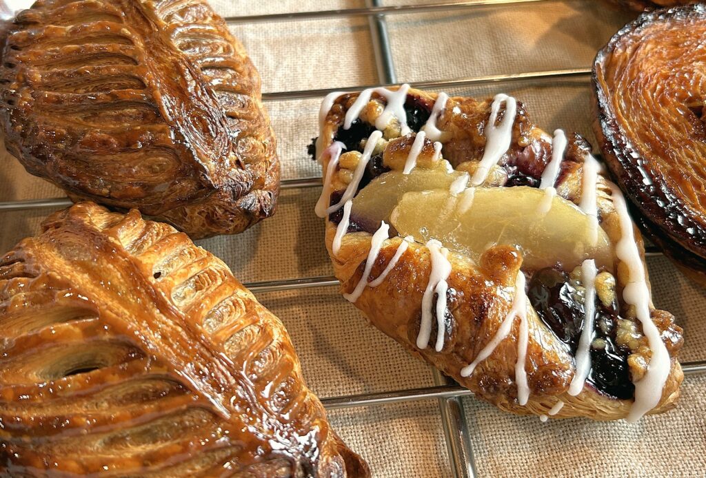 甘い系パンも豊富に並ぶなか、店主イチオシは「トゥッティ」。ドイツの勤務先で毎日朝食で食べていた思い出のパンを、甘さ控えめにアレンジしたものだそう。サクサクのデニッシュ生地に、チェリーとブルーベリー、洋梨のコンポート、アプリコットジャムをのせ、口の中に広がる味わいが後を引くおいしさ。ケーキ級の快楽に満たされること間違いなしです!