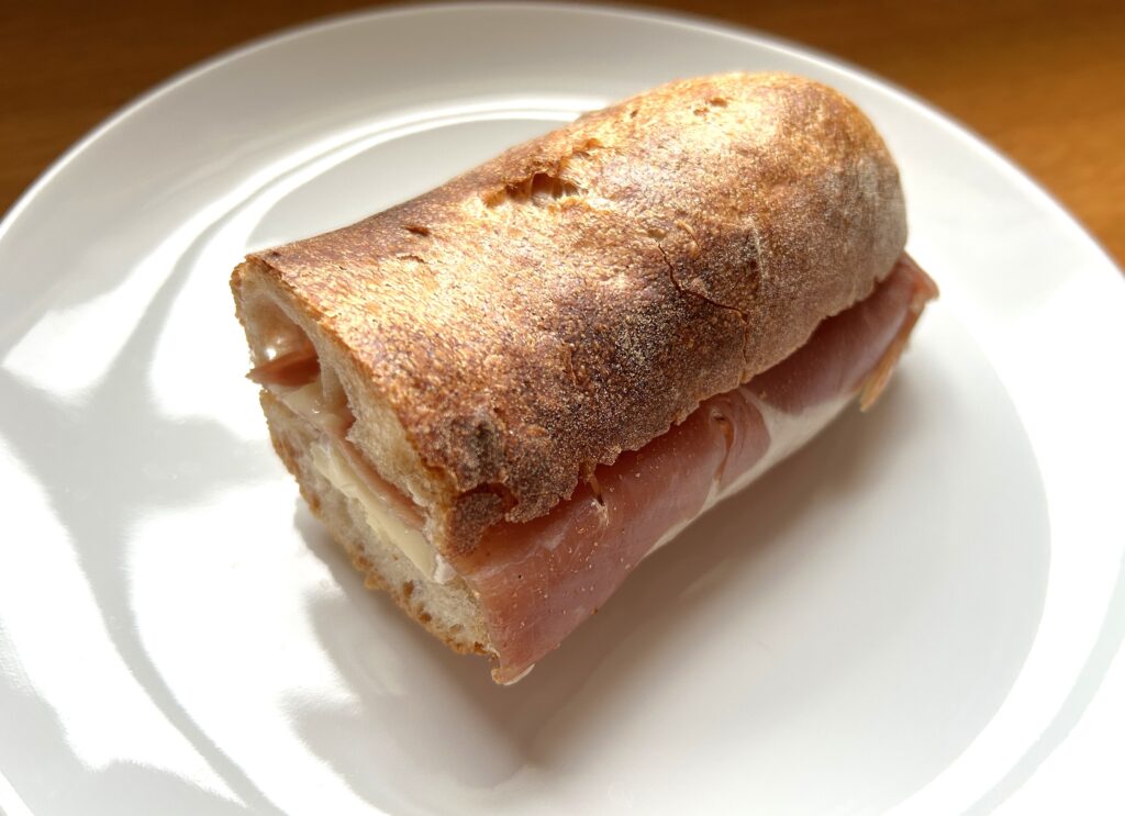 そのままでもおいしいハルユタカバゲットですが、贅沢に使った惣菜パンもおすすめ。無添加の生ハムとチーズをはさんだバゲッドサンドは、小麦の風味、生ハムの塩味と旨味、チーズのコクが絶妙のハーモニーです。