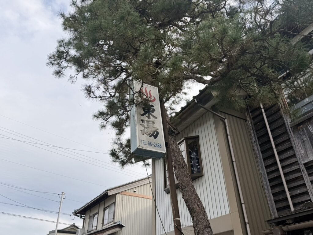 松の木と「東湯」の看板が目印。観光エリアの七間通りからも徒歩10分ほどなので、まち散策の後に少し足を伸ばして立ち寄るのもおすすめです!