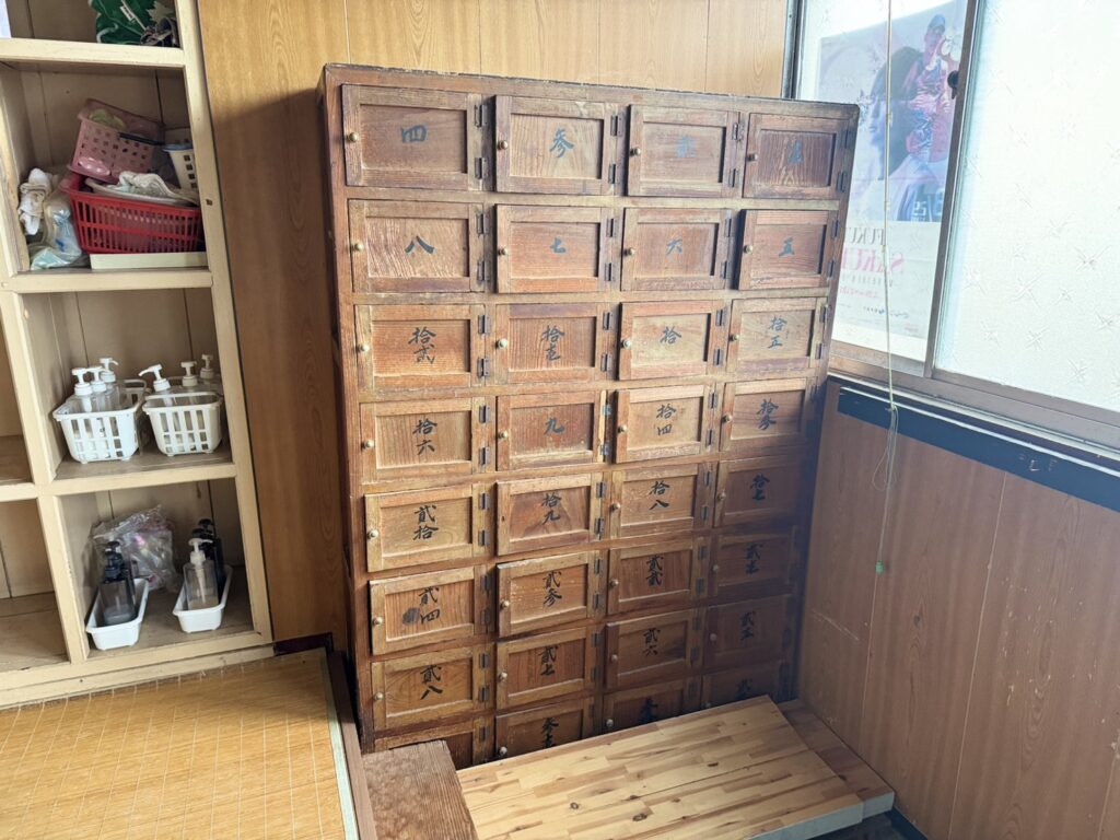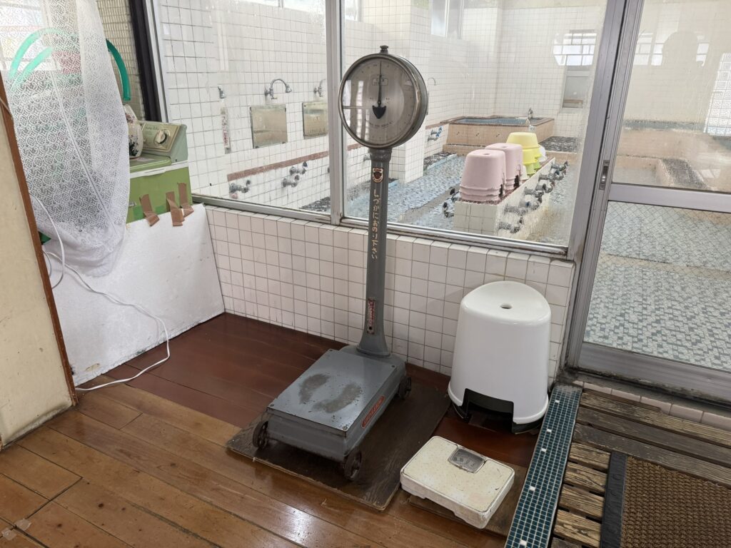 漢数字が書かれた木製の下駄箱や、キロ表示の下に「貫(カン)」の単位が残る体重計など、昔ながらの銭湯の雰囲気が、館内の至る所に残っています^^