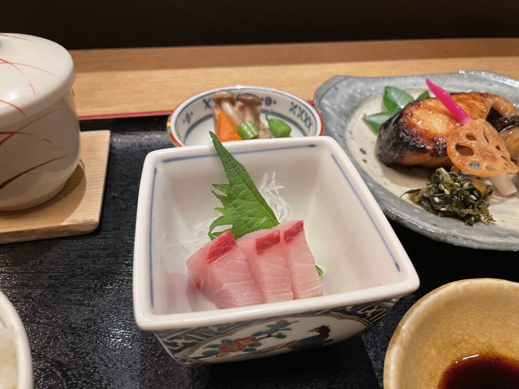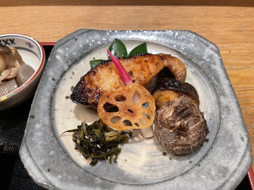 ランチのおすすめは「焼き魚定食」。今回は、脂ののった銀鱈を丁寧に漬け込んだ幽庵焼きを選びました。ふっくらと厚みのある身に、みりんの上品な甘みが重なり、ご飯がすすむ味わいです。特別栽培米コシヒカリのもっちりとした甘み、濃い出汁が広がるお味噌汁も格別。さらに、新鮮なお造りや、なめらかで上品な茶碗蒸しも添えられ、大満足です。焼き魚は注文後に焼き上げられるため、事前予約をしておくと安心ですよ。