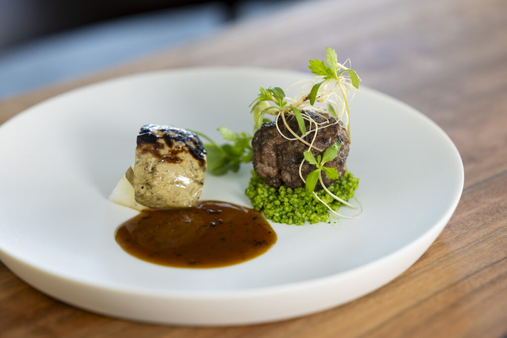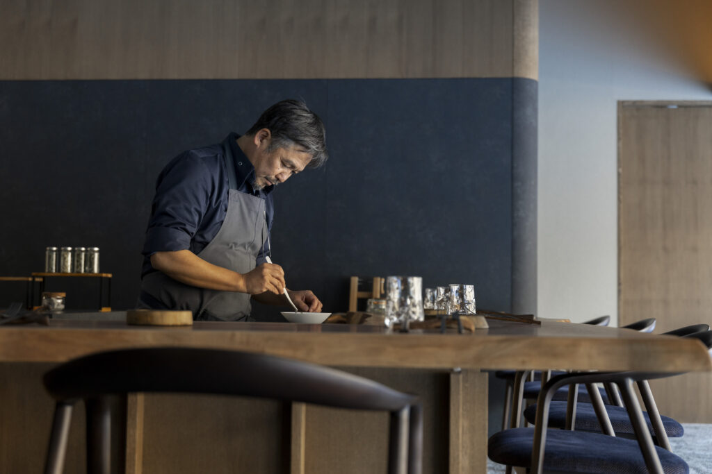 “山・川・大地・海”をテーマに、季節の風景とともに食材の魅力を味わえる、特別な時間が広がっています。エントランスで目を引くのは、石川県の形をしたオブジェ。県境に近いこの場所から、石川の魅力を発信していく——そんなストーリーが、ここから始まります。店内のテーブルや器は、県内作家とシェフが一緒に相談しながら選び、形にしてきたもの。空間の隅々にまで、心地よさへの気配りが行き届いています。食事をする前から、空間そのものが一つの体験になっていて、静かに気持ちが整っていくのを感じました。
