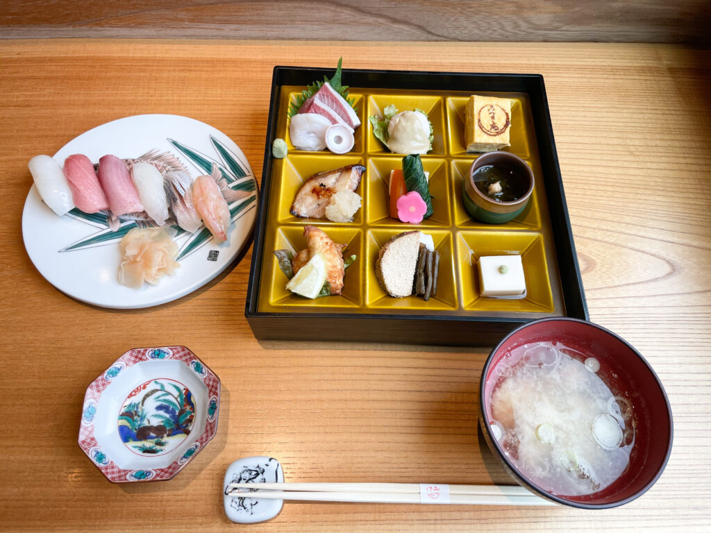 ランチで提供されているのは、「松花堂弁当 寿司」。追加でデザートを付けることもでき、限定30食、売り切れ次第終了の特別なランチです。まず運ばれてくるのは、茶碗蒸し。蒸したての温かさと、出汁のやさしいうまみに、ほっとします。続いて登場するのが、松花堂弁当とお寿司、あら汁。彩り豊かで華やかな見た目に、どれからいただこうか迷ってしまいます。一品一品、素材の味を大切にしたやさしい味わいです。そして、お待ちかねのお寿司。華やかな松花堂弁当にお寿司が添えられた組み合わせは、贅沢ランチにぴったり。どのネタも新鮮で、口の中でとろけるようなおいしさでした。