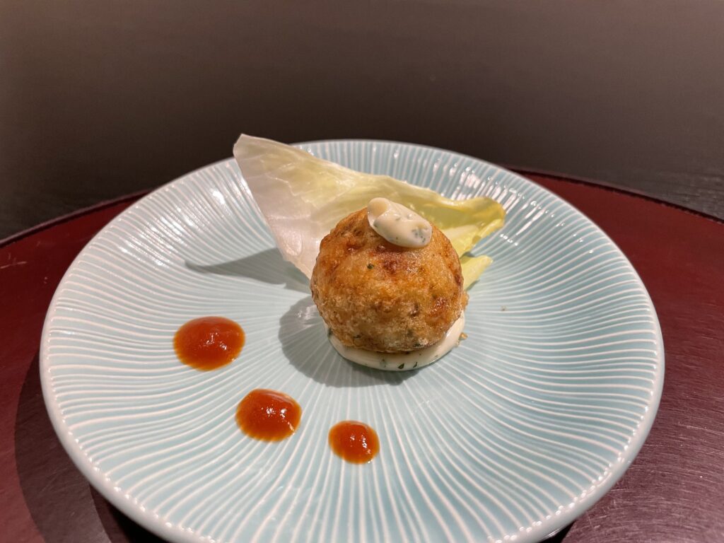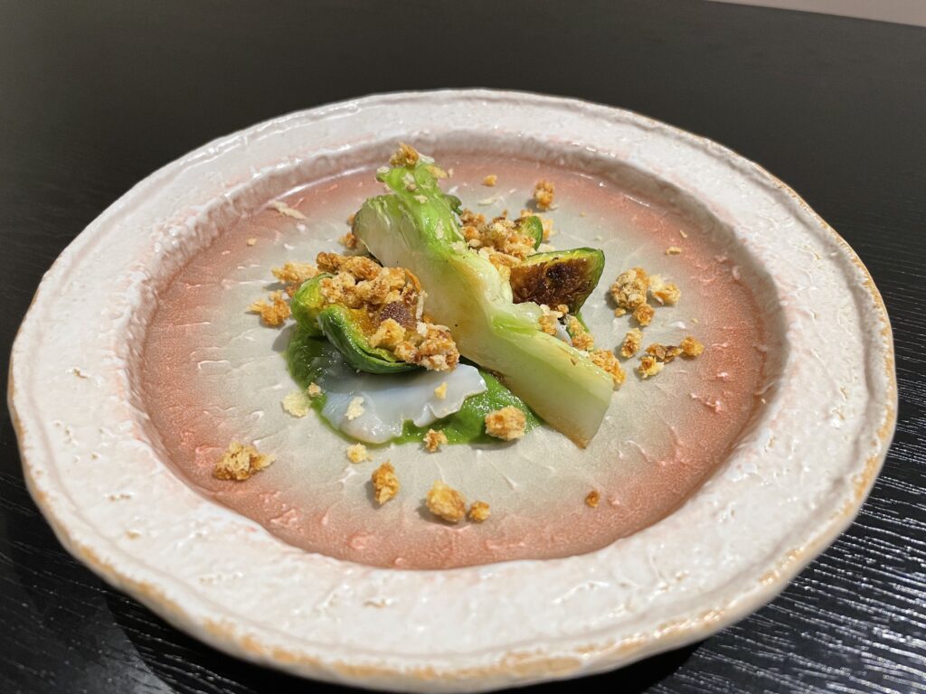 メニューはコース料理のみ。全10品が順番に提供され、内容は毎月変わります。これまで同じメニューを出したことがないそうで、訪れるたびに新しい味に出会えるのも魅力です。このコースは「魚も肉も、少しずつおいしいものを楽しんでほしい」という店主の想いから生まれたそうです。